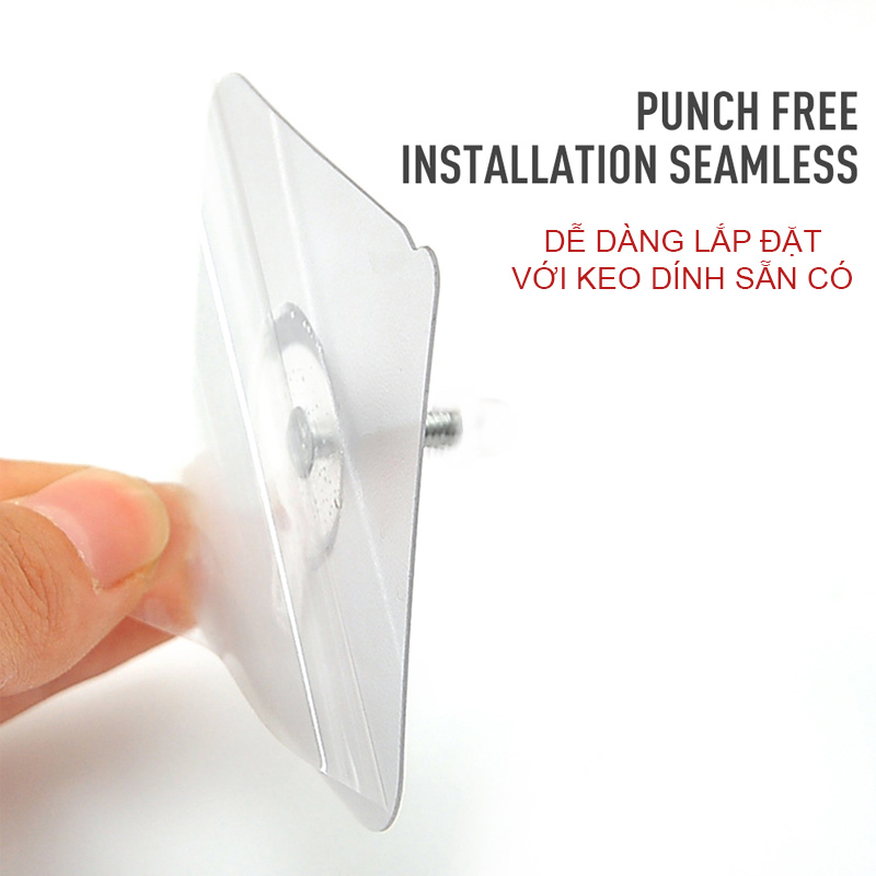 Miếng dán tường trong suốt 72x72mm có bu lông đai ốc D4mm được làm bằng nhựa dẻo trong suất với 1 mặt có keo dán chắc chắn (chỉ cần bóc miếng bảo vệ keo, dán lên tường là xong) giúp dễ dàng treo các giá đỡ, giá treo… dễ dàng mà không cần phải khoan tường