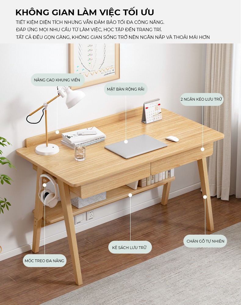 - Chất liệu: Gỗ MDF phủ melamine cao cấp chống xước - chân bàn gỗ tự nhiên