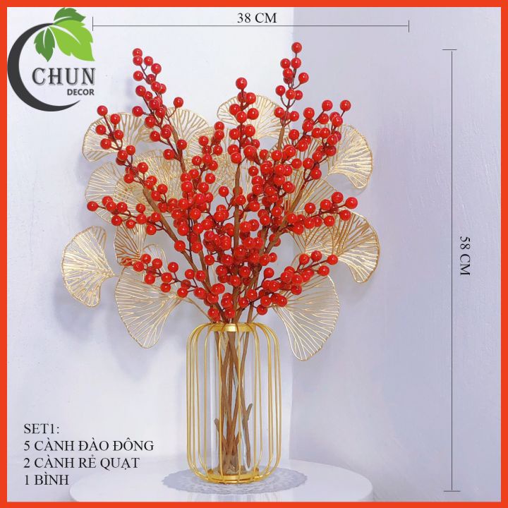 - Cành điểm ánh kim sang trọng, làm nổi bật sắc đỏ đào đông