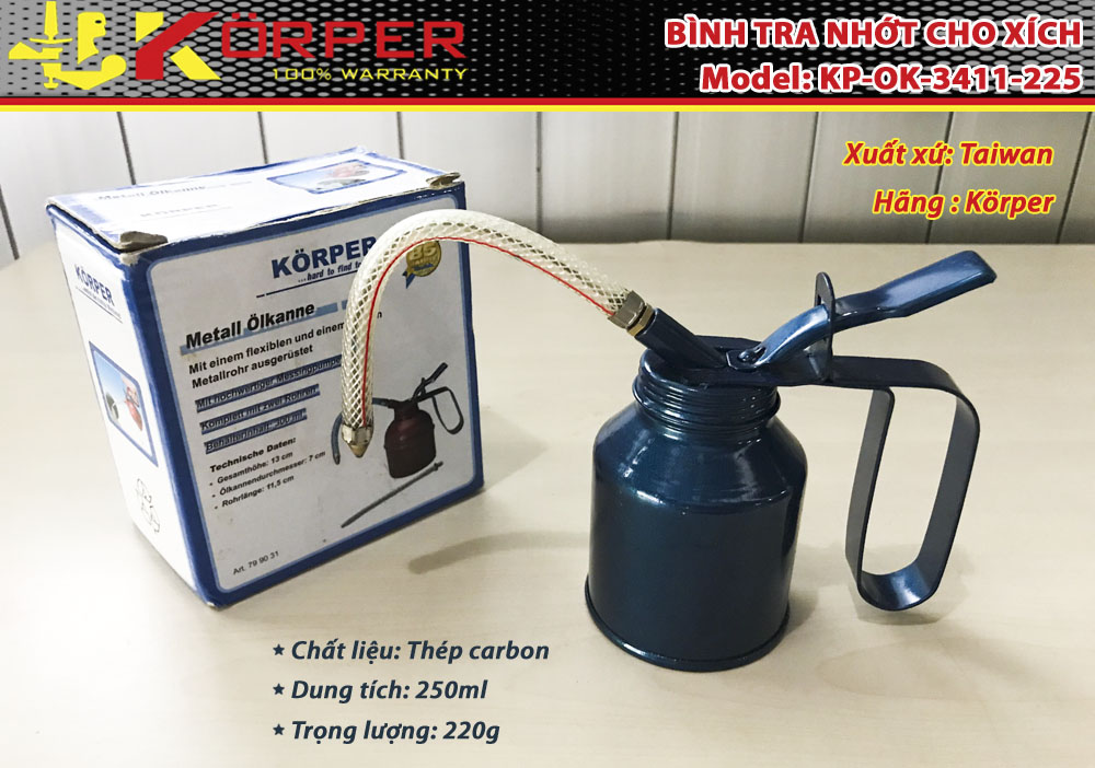 - Bình Tra Nhớt cho xích Körper KP-OK-3411-225 chuyên dùng để đựng nhớt và xịt nhớt vào răng xích của xe. Giúp cho xích có độ trơn giảm ma sát khi quay.