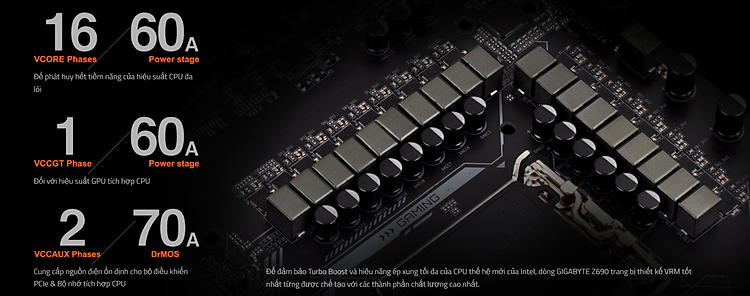 16 + 1 + 2 phase nguồn cấp điện (16 cho CPU, 1 cho iGPU, 2 cho phần khiển PCIE và RAM): Đảm bảo cho mọi nhu cầu của người dùng từ cơ bản đến Overclocking các CPU đa nhân mạnh nhất