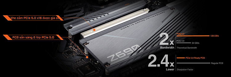 Bo mạch chủ GIGABYTE Z690 đã sẵn sàng hoạt động với các thiết bị PCIe 5.0 sắp tới, những thiết bị dự kiến sẽ có băng thông gấp đôi so với các thiết bị PCIe 4.0 hiện tại. Để đạt được tốc độ cao và duy trì tính toàn vẹn của tín hiệu, GIGABYTE R&D sử dụng PCB trở kháng thấp để mang lại hiệu suất tối đa.