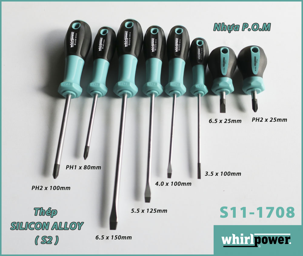 - Bộ tô vít 8 cây Whirlpower S11-1708 được thiết kế dành cho thợ kỹ thuật, các nhà máy, xí nghiệp với 8 cây tô vít có kích thước thông dụng nhất. Với thân được làm từ chất liệu Silicon Alloy giúp cho mũi vít rất cứng nhưng có đàn hồi sẽ làm cho mũi vít của bạn không bị hư hại khi vặn. Tay cầm với chất liệu nhựa POM tạo cảm giác thoải mái cho tay của bạn khi làm việc liên tục trong nhiều giờ.
