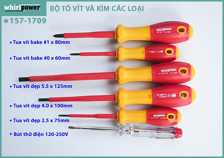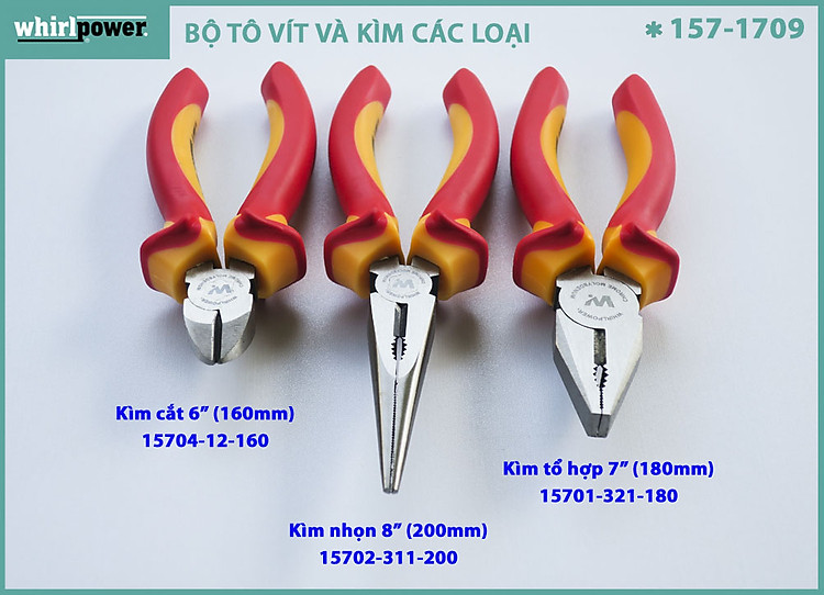 - Bộ Tô Vít và Kìm các loại Whirlpower 157-1709 được thiết kế cho các bạn thuộc lĩnh vực điện cao thế, bộ 157-1709 cách điện được 1000V. Tay cầm được bọc nhựa một cách rất an toàn chỉ chừa phần mũi ra để làm việc.