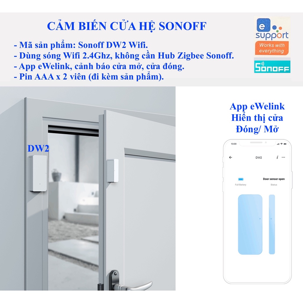 Cảm biến cửa Sonoff DW2 kết nối Wifi, App eWelink, GoogleAssistant, Alexa, Home Assistant.