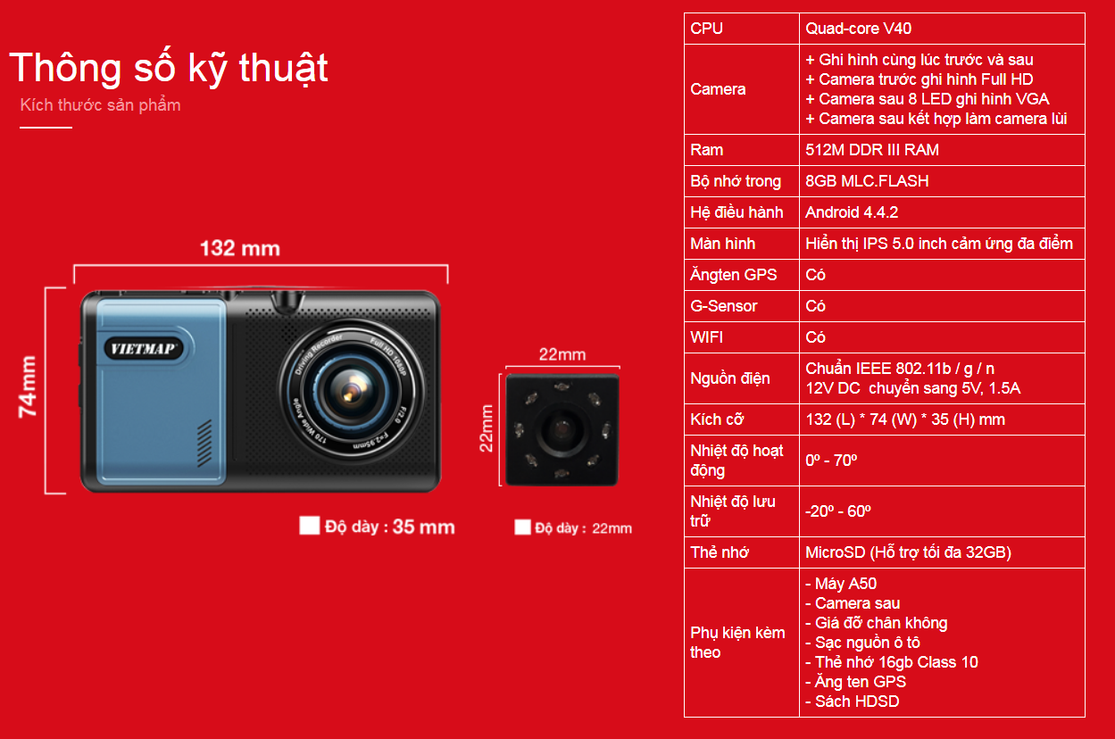 Camera Hành Trình Ô Tô Ghi Hình Trước Sau Tích Hợp Dẫn Đường GPS VIETMAP A50 + Thẻ Nhớ 16GB - Hàng Chính Hãng