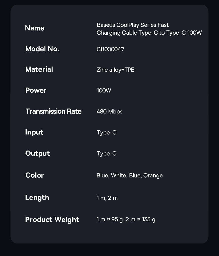 | Tên | Cáp Sạc Nhanh C to C Baseus CoolPlay Series Fast Charging Cable Type-C to Type-C 100W |
