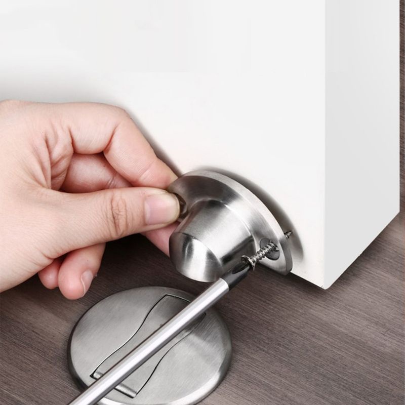 Chặn cửa thông minh bảo gồm 2 bộ phận: 1 bộ phận gắn vào cửa có nam châm, 1 bộ phận gắn dưới sàn chỉ cao 5 mm, nên ko gây vướng.
