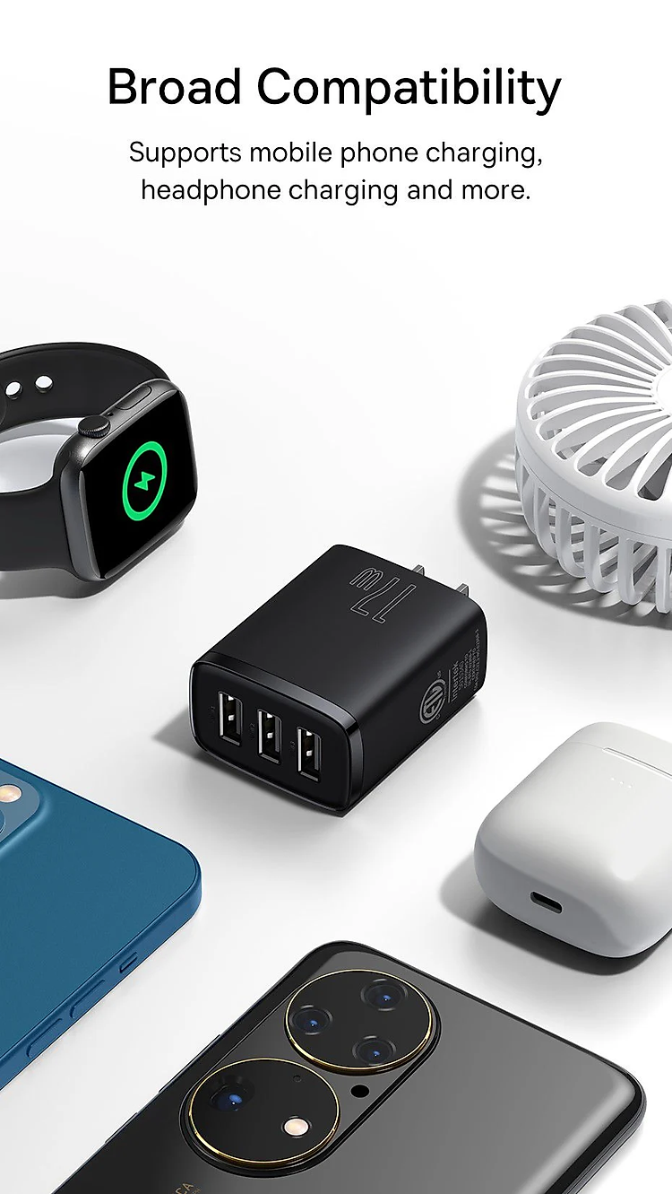Ngoài ra Cóc củ sạc nhanh 17W đa năng 3cổng USB A hiệu Baseus Compact Charger 3U còn hỗ trợ sạc nhanh cùng lúc 3 thiết bị tiết kiệm đáng kể thời gian cho bạn.