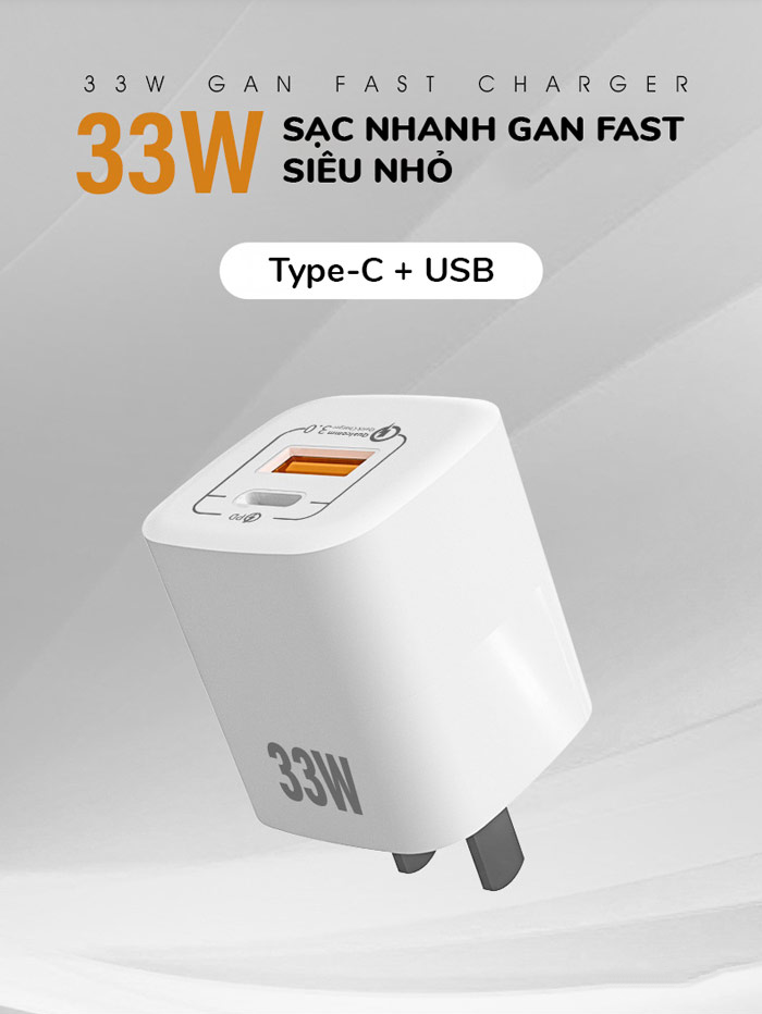 Củ sạc nhanh công nghệ GAN kích thước siêu nhỏ (chỉ 33mm) công suất sạc lên đến 33W và 65W