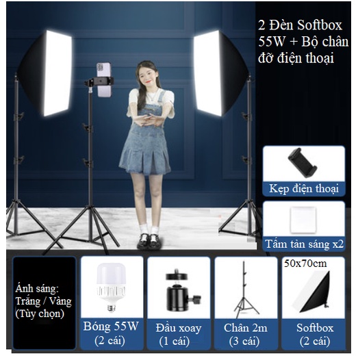 Bộ sản phẩm bao gồm: 3 chân 2m, 2 Softbox 50x70cm kèm dây nguồn, 2 Bóng đèn Led 55W, 1 củ xoay điện thoại, 1 kẹp điện thoại (K08)