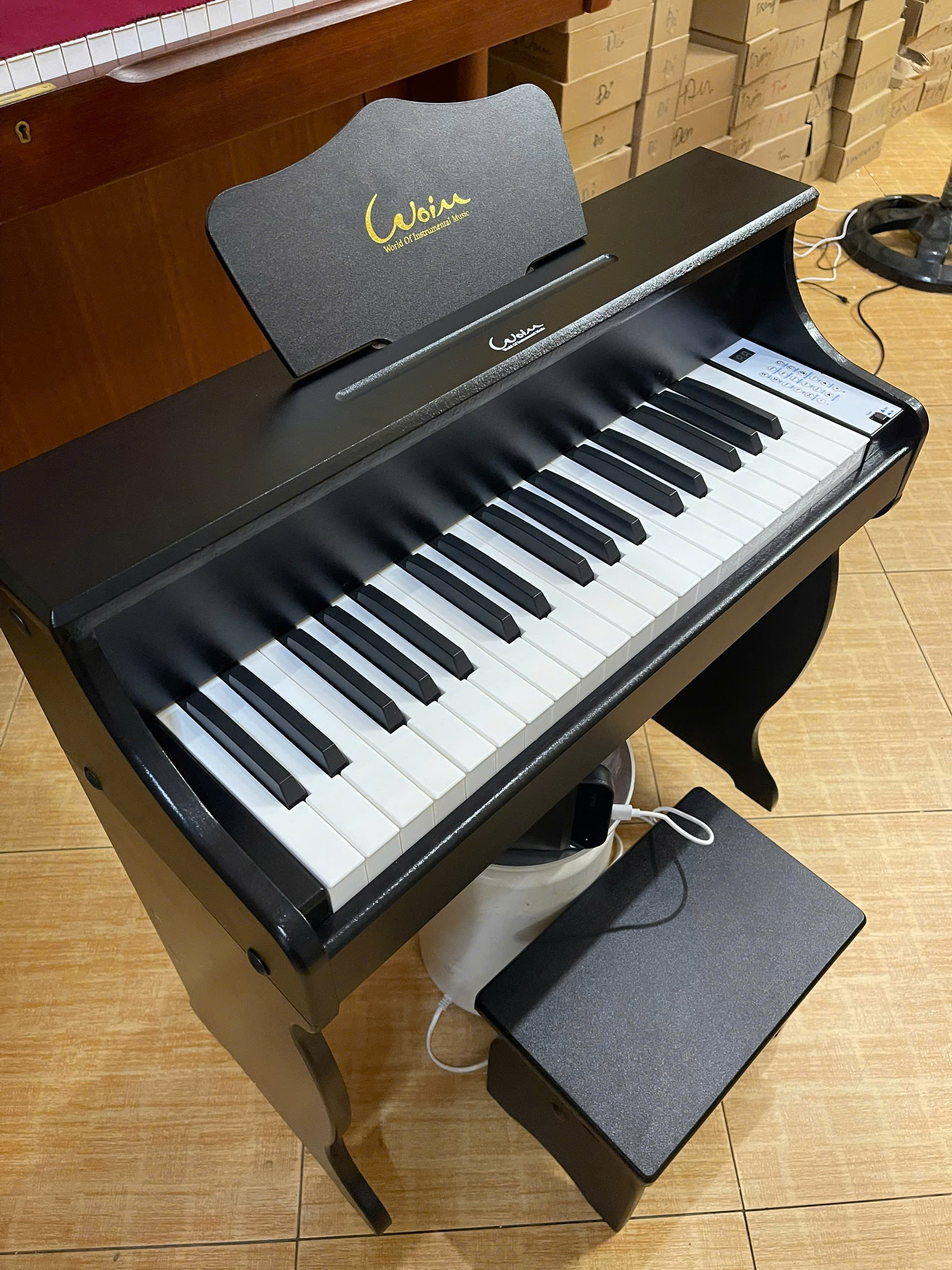 - Đàn Piano Gỗ 37 Phím Woim-Baby Bản Quốc Tế Cho Trẻ Tập Chơi Có Ghế, Chân Đế, Giá Nhạc, Cổng Cắm Headphone, Pedal Và Micro dành cho bé tập học nhạc