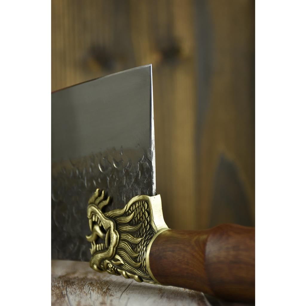 Chất liệu tay cầm: gỗ CẨM LAI, khâu và chuôi cuối dao bằng đồng thau