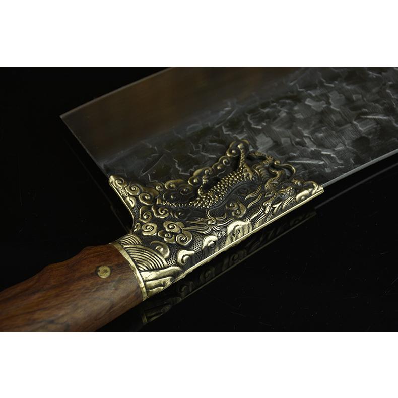Chất liệu tay cầm: gỗ CẨM LAI, khâu và chuôi cuối dao bằng đồng thau