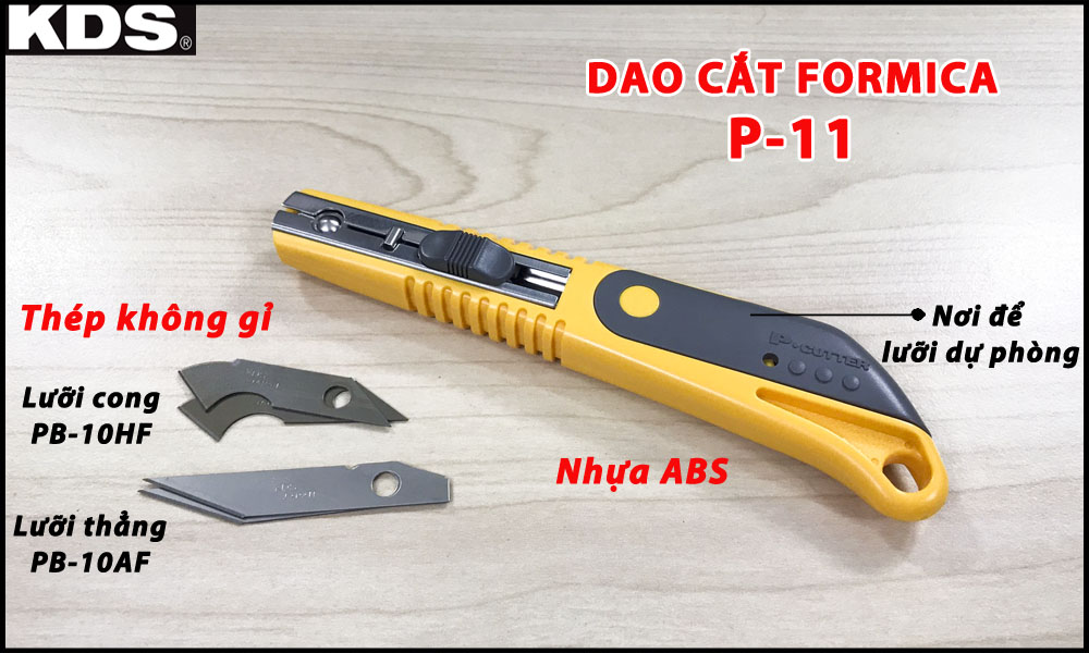 - Dao cắt Foormica KDS P-11 sử dụng 2 loại lưỡi dao PB-10HF (lưỡi cong) và PB-10AF (lưỡi thẳng) chuyên dùng cho cắt mica, khi mua dao sẽ có đi kèm mỗi loại 2 lưỡi. Bạn cũng có thể cắt được nhiều vận dụng khác như giấy, carton, vải, thạch cao…Lưỡi dao KDS rất sắc bén và bền giúp bạn tiết kiệm thời gian lẫn tiền bạc khi làm việc.