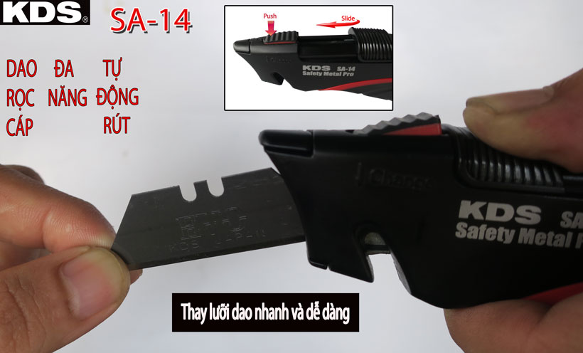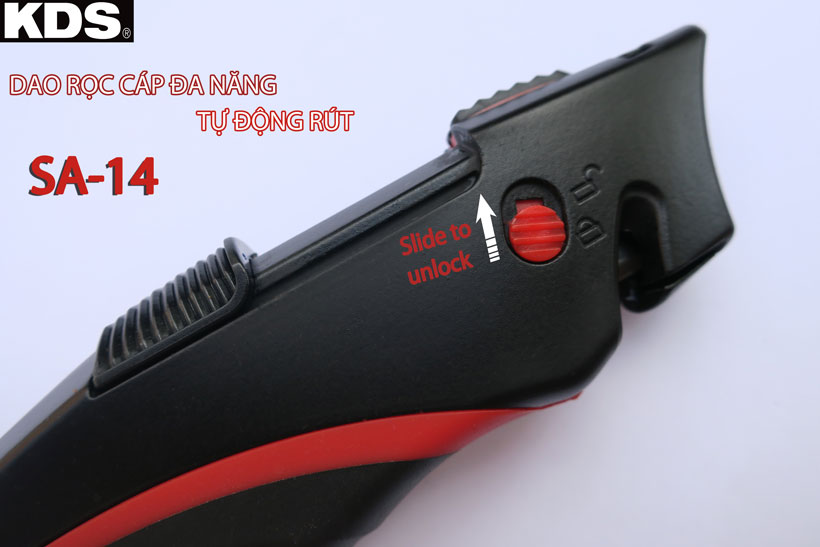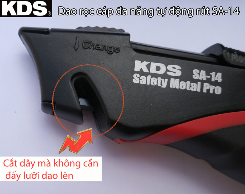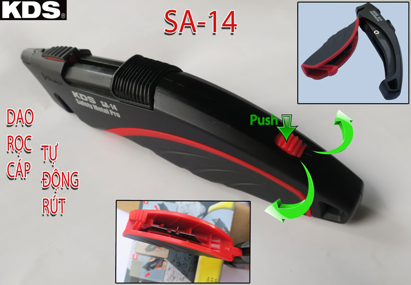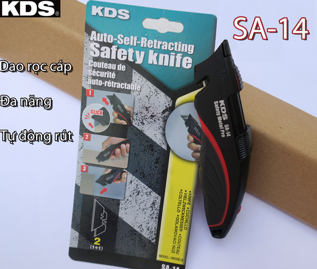 - Dao rọc cáp đa năng tự động rút KDS SA-14 là dao tự động rút giữ an toàn cho người sử dụng cũng như bảo vệ khỏi trẻ nhỏ khi không còn làm việc.