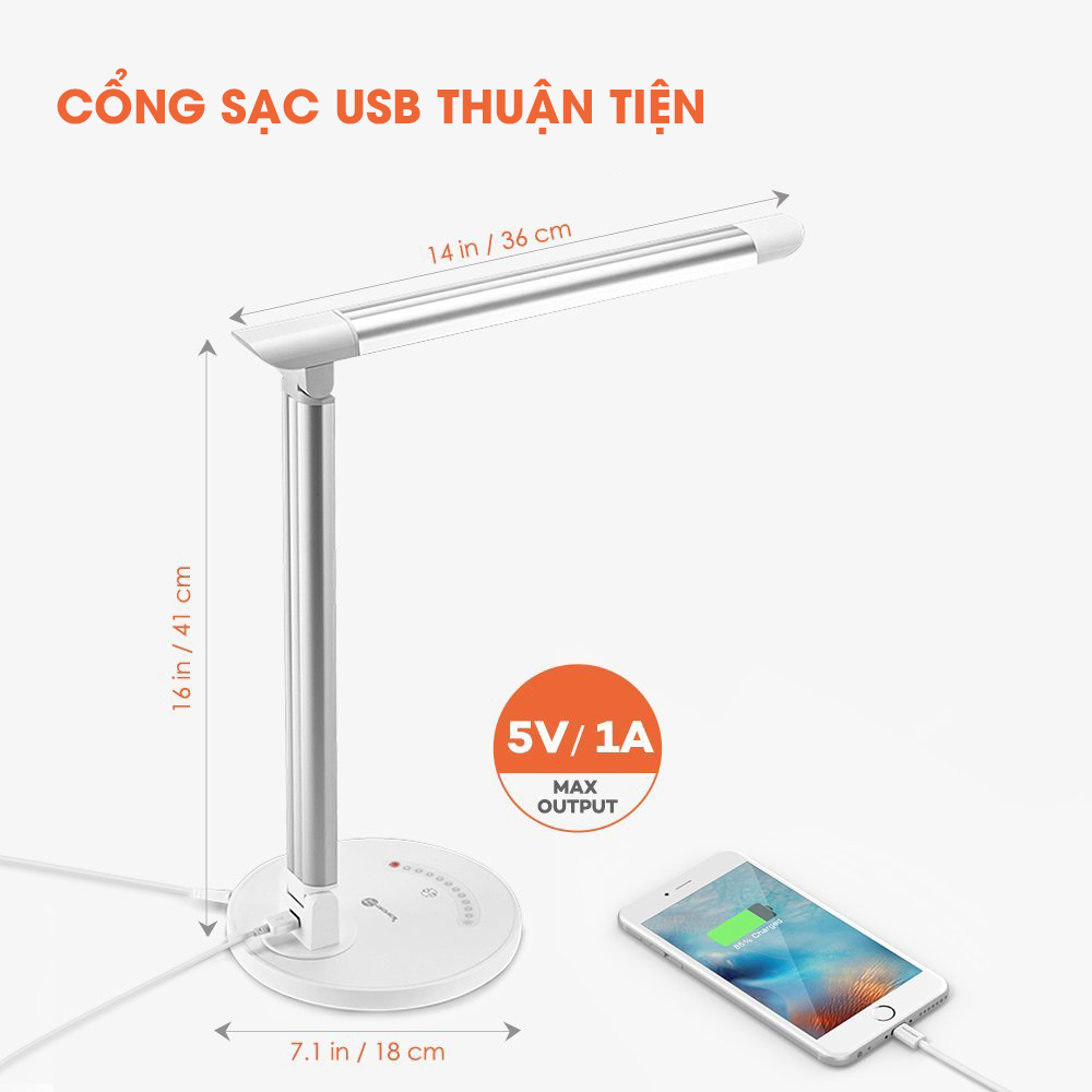 • Đèn LED đển bàn tích hợp cổng sạc USB để sạc điện thoại thông minh, máy tính bảng hoặc thiết bị đọc sách điện tử