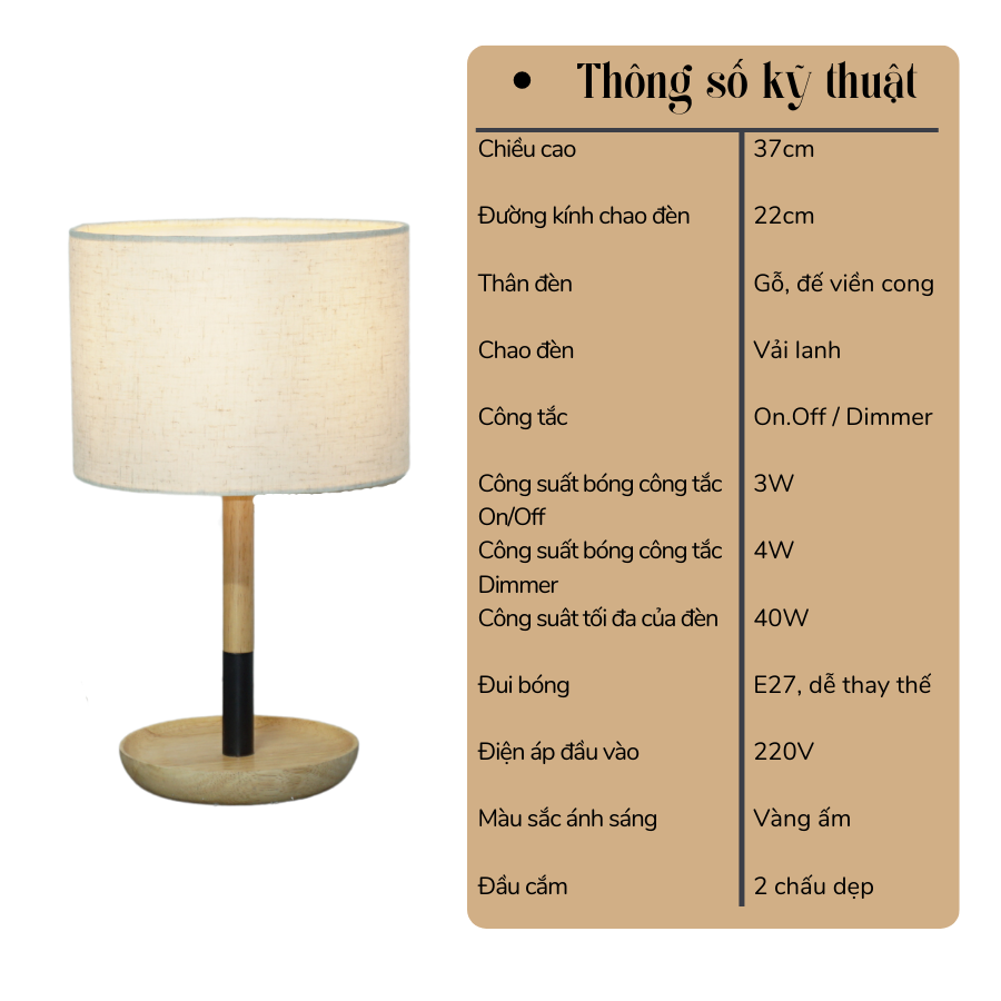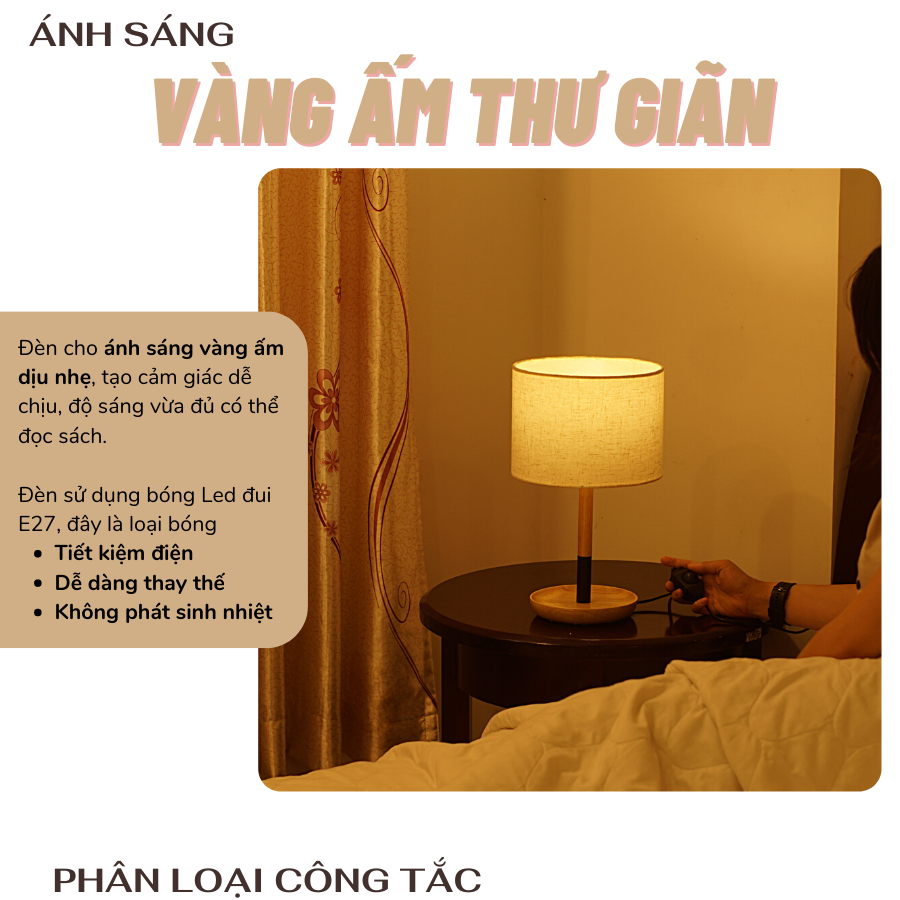 Đèn Ngủ Để Bàn Gỗ HUTA G10 Chao Tròn Vintage Dễ Thương, Decor Trang Trí Phòng Ngủ Khách Sạn, Đọc Sách Đầu Giường, Điều Chỉnh Độ Sáng, Bóng Led Sáng Vàng Tiết Kiệm Điện