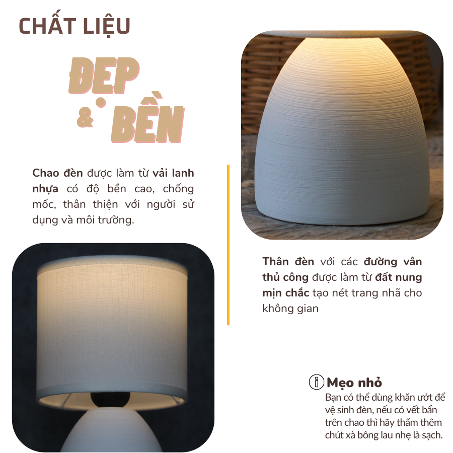 - Chất liệu đèn ngủ: thân đèn được làm từ đất nung mịn chắc, chao đèn làm từ vải lanh nhựa
