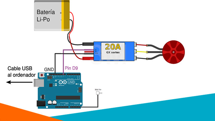 Mình sẽ hướng dẫn các bạn sử dụng arduino UNO R3 để điều khiển động cơ này một cách đơn giản nhất nhé. Để điều khiển được thì mình cần dùng một thiết bị gọi là ESC có tác dụng băm xung cho chân tín hiệu.