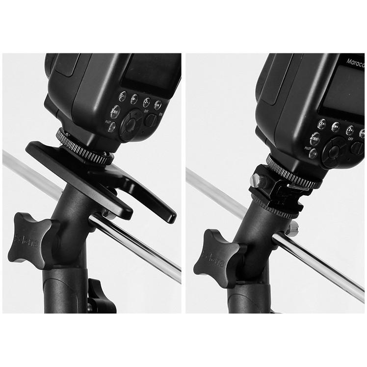 Gá giữ đèn Flash kèm khe cắm dù cố định lên chân đèn hay tripod đều được. Đầu ốc linh hoạt giúp điều chỉnh góc độ một cách nhanh chóng và chính xác. Gá giữ đèn được làm từ hợp kim chắc chắn, nhỏ nhẹ d...