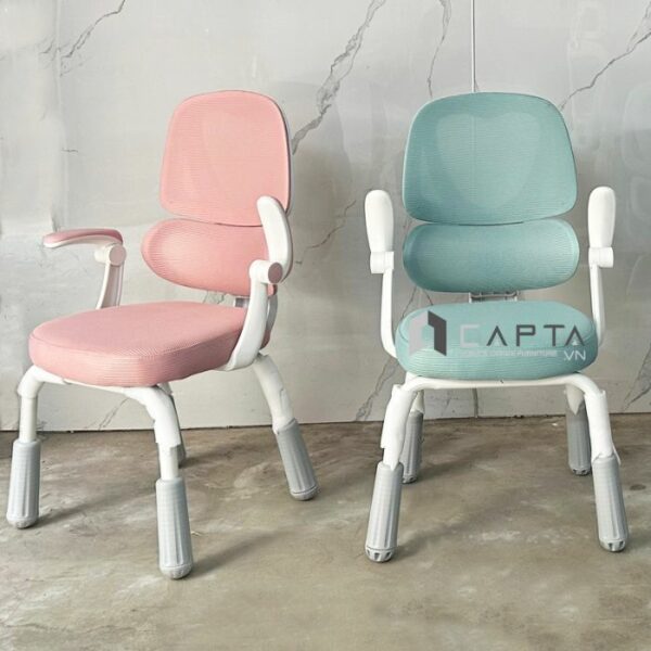 Ghế lưng lưới thoáng khí hạn chế hầm bí khi ngồi, bọc nệm vải gồm ba màu xanh, xám, hồng phổ biến, thích hợp cho cả bé trai và bé gái.