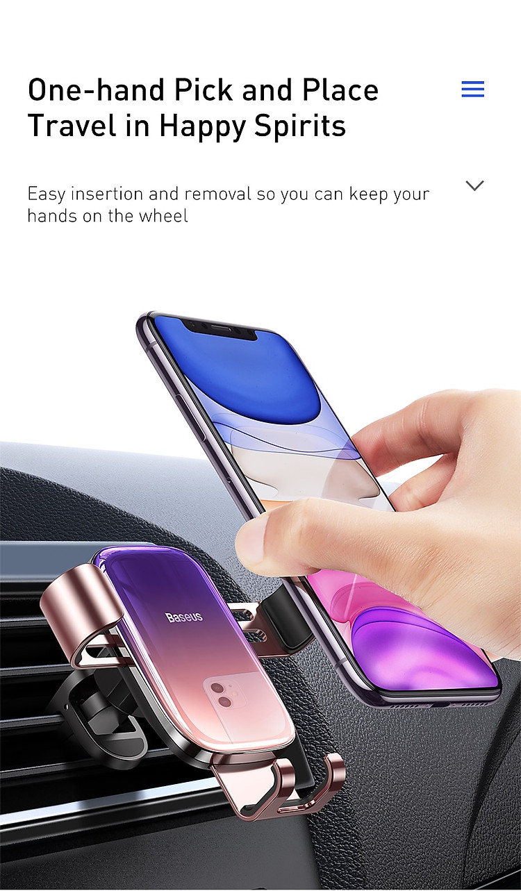 Giá đỡ điện thoại thế hệ mới Baseus Glaze Gravity Car Mount được lắp ở lỗ thoát khí bên dưới nên chúng hoàn toàn không ảnh hưởng gì đến tầm nhìn của bạn khi láy xe, giúp bạn lái xe dễ dàng. Hỗ trợ thao tác 1 tay tiện lợi.