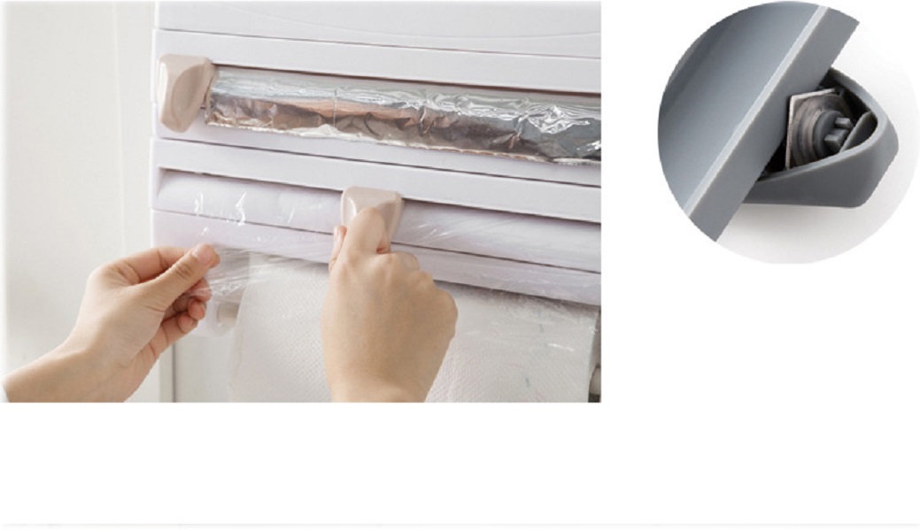 Sản phẩm có 3 ngăn để cuộn giấy: màng bọc thực phẩm, giấy bạc, giấy ă