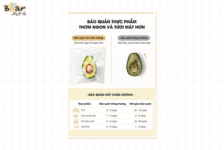 Có thể bạn chưa biết: Hút chân không là một trong những cách bảo quản thực phẩm được đánh giá là hiệu quả nhất. Với 4 tính năng đa dạng: hút chân không, hàn miệng túi, cắt túi và hút chân không dạng hộp, máy hút chân không thực phẩm Bear phiên bản Quốc tế đem lại sự tiện dụng cho gia đình bạn, giúp bảo quản thực phẩm luôn được tươi ngon trong nhiều ngày.