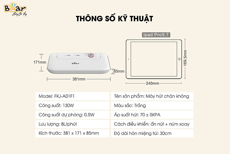 | Công suất | Với công suất 130W Máy hút chân không Bear có thể hút được 8L khí trong mỗi phút, tương đương với 30 giây trong 1 lần hút nhờ áp suất 70KPA cực mạnh. |