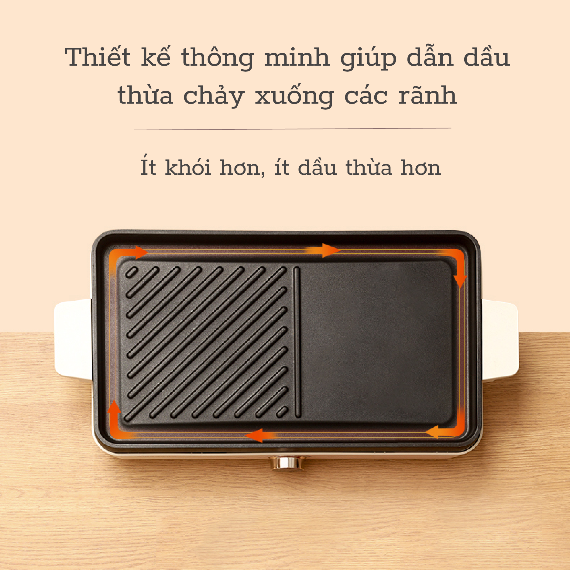 Lòng chảo lớn, cho phép nướng nhiều các món ăn cùng một lúc. Thiết kế lòng chảo thông minh, cho phép dẫn dầu thừa chảy xuống các rãnh phía bên dưới để khiến chảo nấu ít khỏi hơn và thức ăn không bị quá nhiều dầu, mỡ.