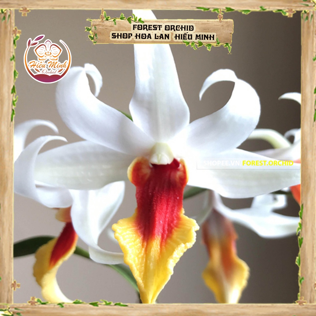 Lan phụ sinh. Thân dài 20 – 30 cm, hình con suốt, lóng dài 2,8 – 3 cm. Lá hình mác, đỉnh chia 2 thùy lệch, dài 4 – 6 cm, rộng 1 – 2 cm. Cụm hoa bên sát đỉnh, 2 – 3 hoa. Hoa màu trắng, đường kính 4 – 4,5 cm, cuống hoa và bầu dài 2,5 – 3 cm. Các lá đài hình mác nhọn, dài 2,5 – 3 cm, rộng 0,8 – 1 cm. Cằm hình cựa, dài khoảng 2 cm. Cánh hoa hình mác, đỉnh nhọn, gốc thót, dài 3 – 3,4 cm, rộng 1,2 – 1,3 cm. Môi màu trắng, hình đàn ghi ta, dài 3 – 3,5 cm, rộng 1,8 – 2 cm, 3 thùy, gốc có một đốm tròn màu đỏ, ở mép đốm toả tia, giữa môi có 3 đường sống dọc; thùy bên hình bán nguyệt; thùy giữa hình bầu dục, đỉnh hơi nhọn, mép gấp nếp răn reo, bề mặt phủ nhú dọc tiếp theo đường sống. Cột cao khoảng 0,5 cm, răng cột hình liềm. Nắp màu trắng, hình mũ, cao.