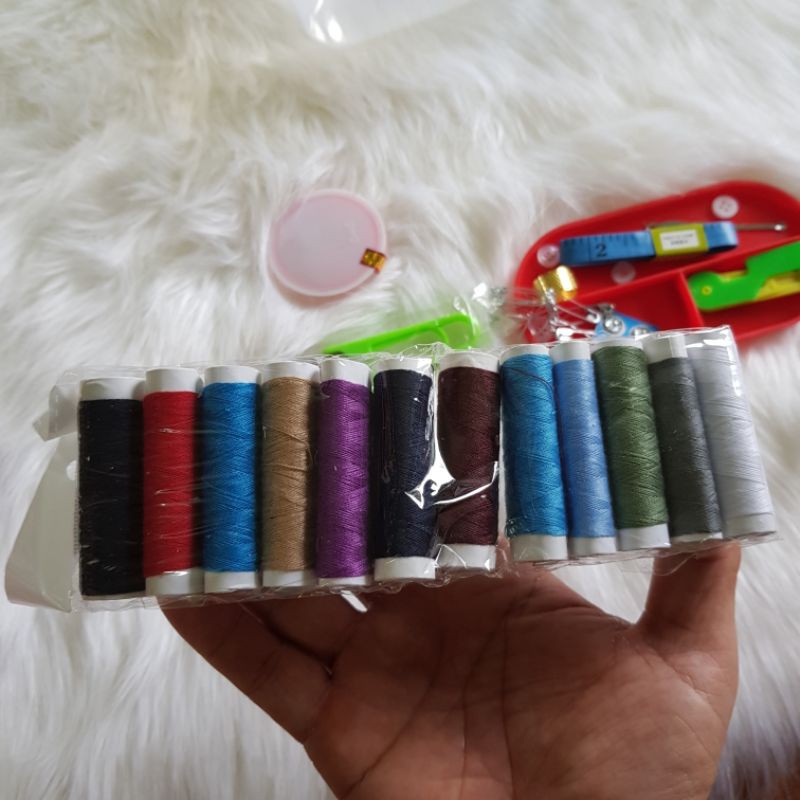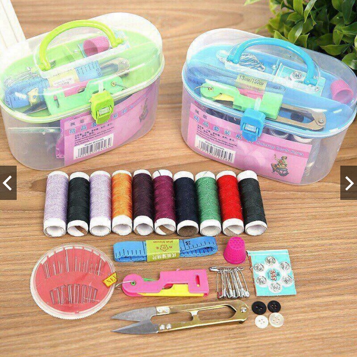 🍀 Bao gồm: 10 cuộn chỉ màu, 01 hộp kim các loại, 01 lấy ráy tai, 01 kéo cắt chỉ, 01 thước dây, 10 kim băng, 2 cúc bấm.