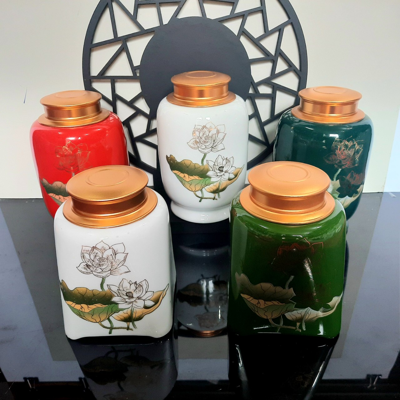 Hũ Đựng Trà là một phụ kiện không thể thiếu trên bàn trà sang trọng của của bạn, Shop chúng tôi trân trọng giới thiệu mẫu Hũ Đựng Trà, lọ đựng chè gốm Bát Tràng nem xanh ngọc lục bảo họa tiết vẽ vàng 18k