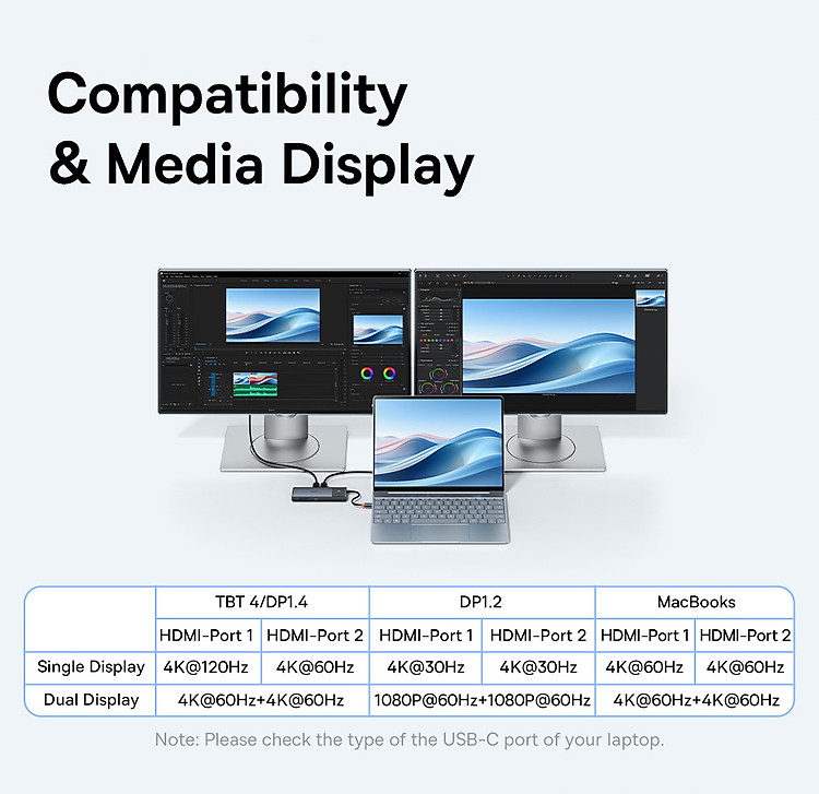 Các cổng kết nối: HDMI4K@120Hz, HDMI4K@60Hz, USB 3.2, Type-C Data, USB 2.0 x2, RJ45, SD/TF, Type-C PD.