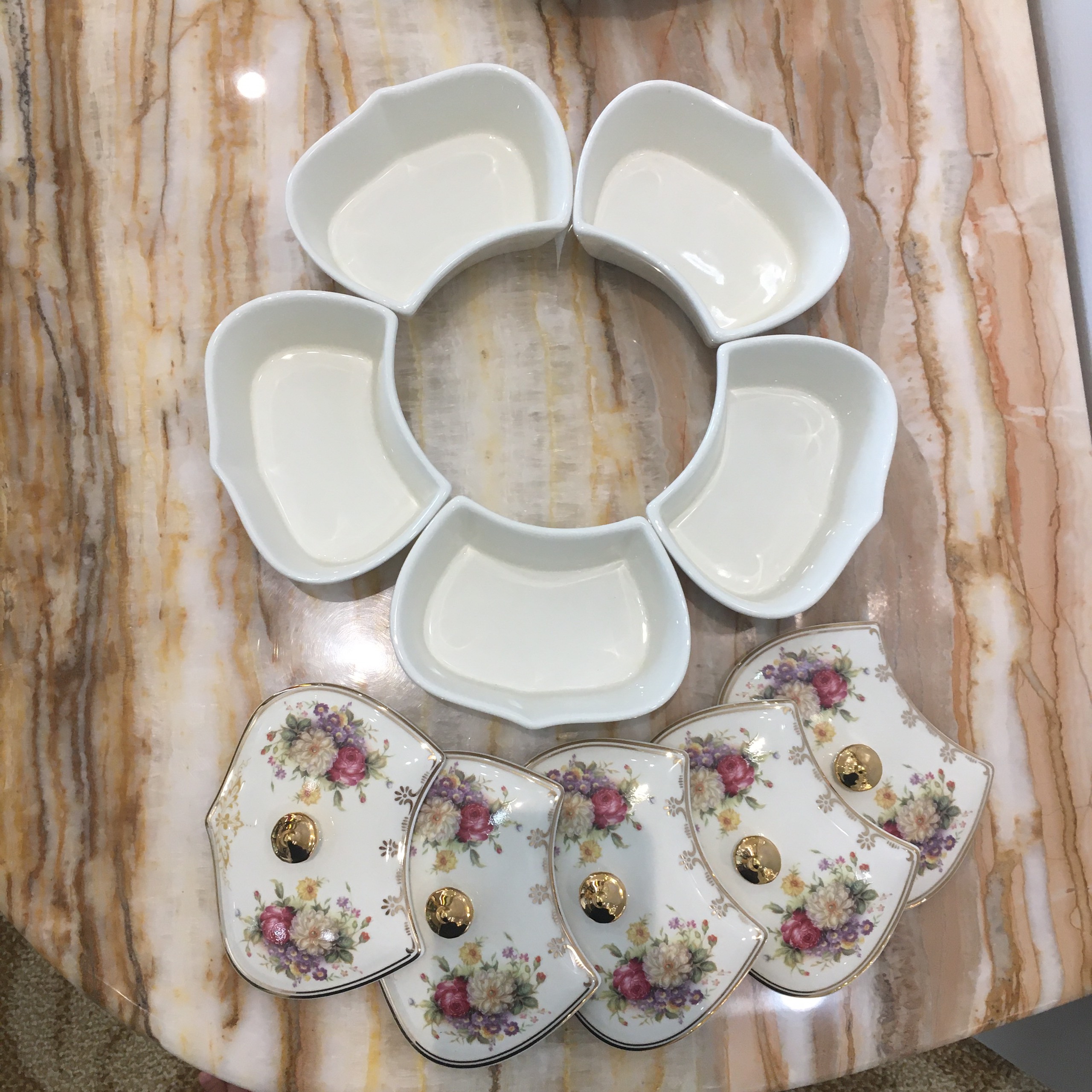 Khay mứt Gồm 1 khay lớn ở dưới với 5 hũ hình cánh hoa và 1 hũ tròn ở tâm