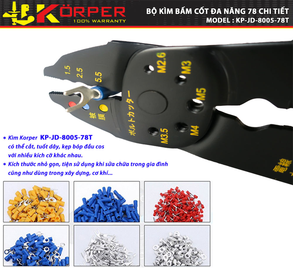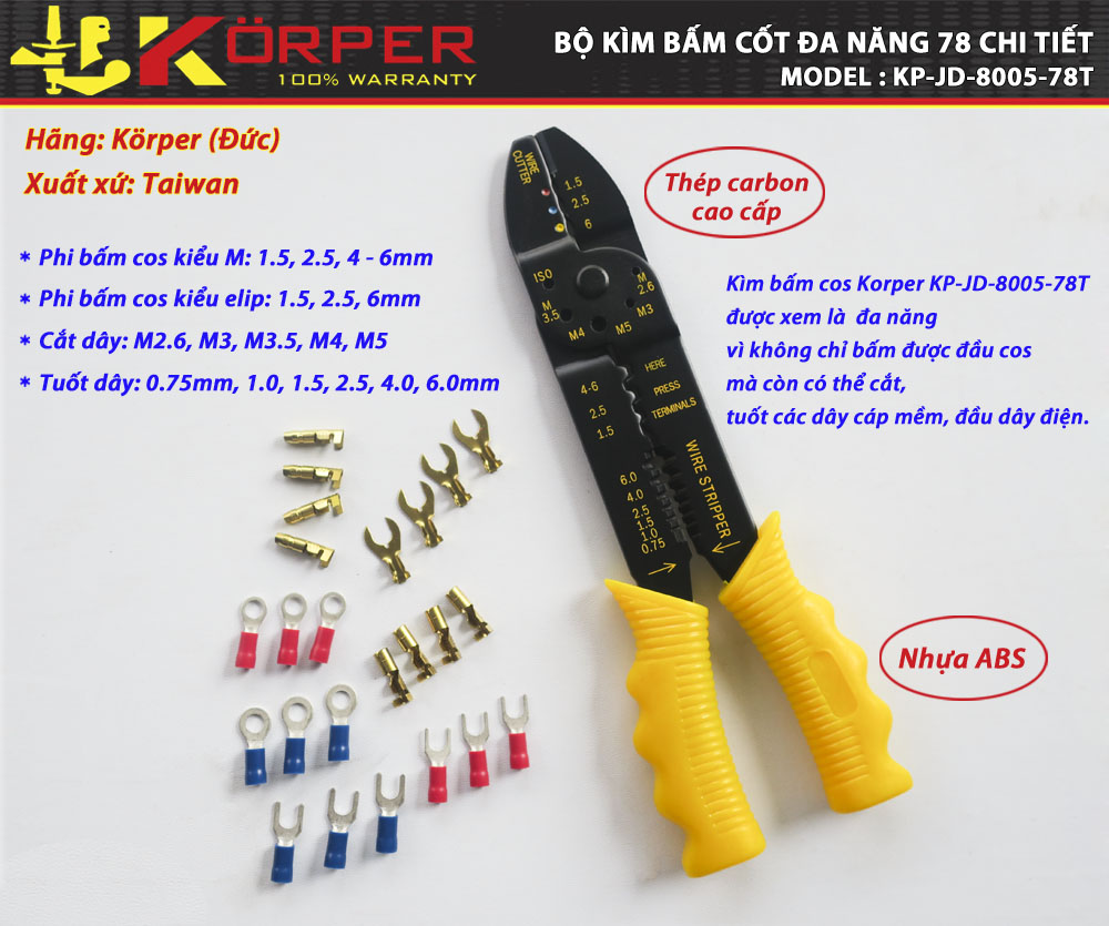 - Kìm bấm cos đa năng Körper KP-JD-8005-78T được xem là kìm bấm cos đa năng vì không chỉ bấm được đầu cos mà còn có thể cắt, tuốt các dây cáp mềm, đầu dây điện.