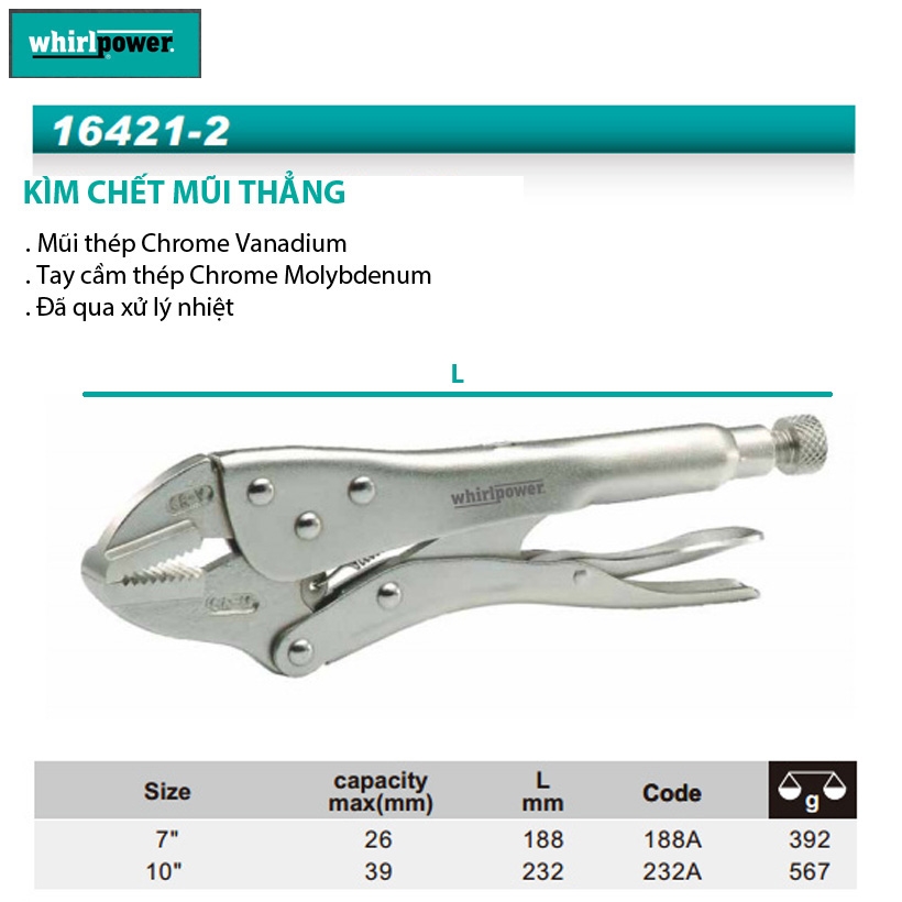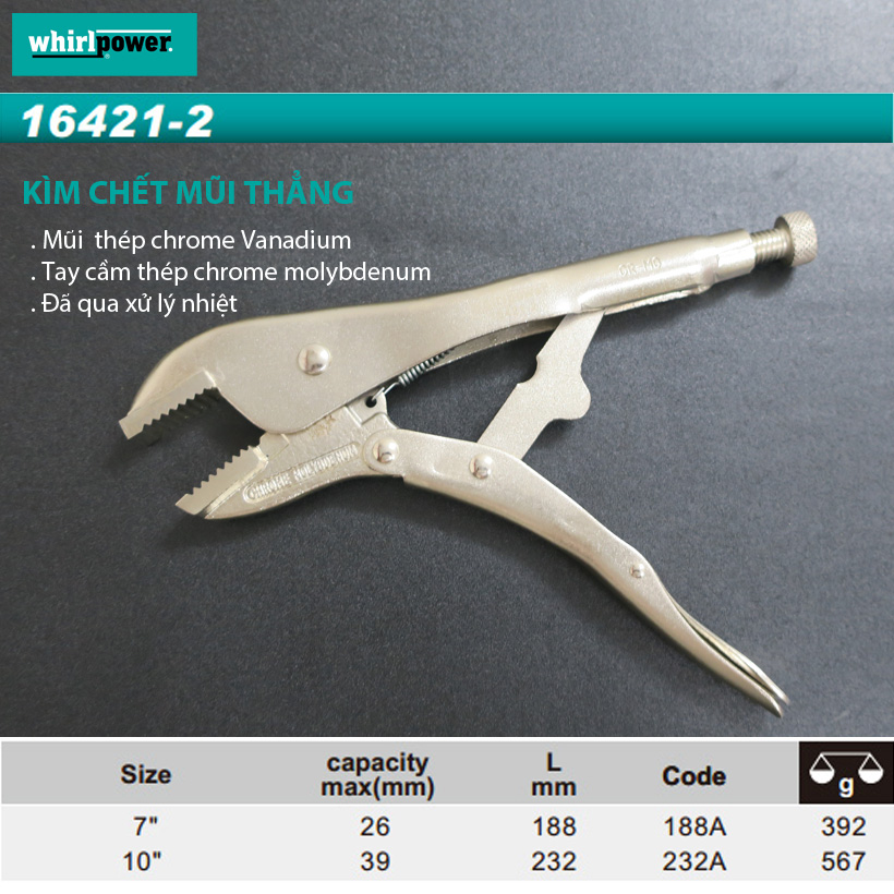 - Kìm chết mũi thẳng 10" Whirlpower 16421-2-232A được làm từ thép Chrome Vanadium, là sản phẩm chất lượng cao được sử dụng để giữ, kẹp, vặn và mở vật dụng. Ứng dụng nhiều trong ngành công nghiệp cơ khí, chế tạo, sửa chữa, lắp ráp,... giúp bạn hoàn thành công việc 1 cách nhanh chóng và hiệu quả hơn.