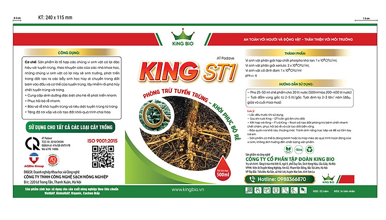 - King ST1 được nghiên cứu và sản xuất bởi Viện Di Truyền Nông Nghiệp Việt Nam ( AGI ) và các kỹ sư của Viện thực nghiệm cho kết quả: Tiêu diệt được các loại trùng: Nội ký sinh, ngoại ký sinh và bán ký sinh. Mang đến bộ rễ khỏe, hấp thụ chất dinh dưỡng nhanh, cây phát triển mạnh, ngoài ra còn tăng độ tơi xốp của đất.