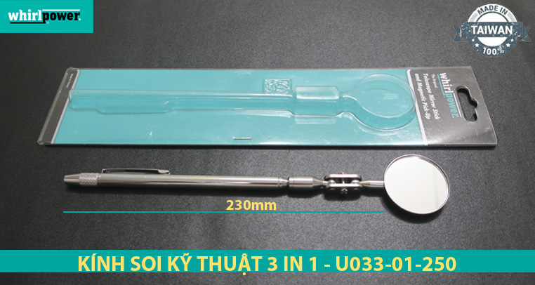 - Tích hợp nhiều dụng cụ đồng thời hạn chế tình trạng thất lạc phụ kiện trong quá trình sử dụng, tiết kiệm diện tích trong túi đồ nghề của bạn là công dụng nổi bật mà kính soi kỹ thuật Whirlpower U033-01-250 mang lại. Kính soi kỹ thuật của hãng Whirlpower được làm hoàn toàn từ Thép Carbon, kính soi có 3 chức năng chính: