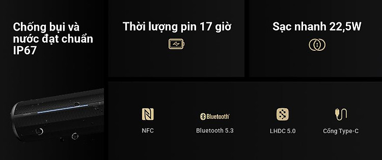 Công nghệ Bluetooth 5.3 mới nhất đảm bảo khả năng kết nối nhanh và truyền dữ liệu ổn định. Loa hỗ trợ codec LHDC 5.0 giúp bạn thưởng thức âm nhạc có độ trung thực cao qua Bluetooth, ngay cả khi đang ở ngoài trời.