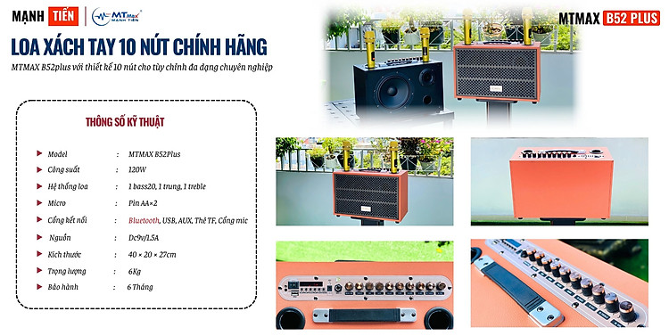 Giới thiệu Loa Di Động Karaoke 10 Nút MTMAX B52 Plus - Bass 20 Âm Thanh Trung Thực Đa Dạng Kết Nối BT, AUX, USB, TF Hàng chính hãng