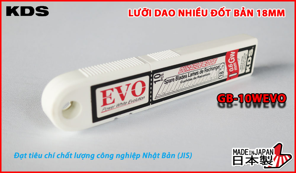 - Lưỡi dao nhiều đốt 18mm KDS GB-10WEVO là loại lưỡi dao rọc giấy có màu trắng và được chia thành 15 đốt, thiết kế này thiên về độ bền. Nếu bạn cần loại lưỡi dao thiên về độ sắc bén, bạn nên tham khảo thêm dòng lưỡi dao màu đen GB-10BEVO. Đây là loại lưỡi dao được chia thành 8 đốt, có cấu tạo, chức năng và cách sử dụng tương tự như lưỡi dao GB-10WEVO.