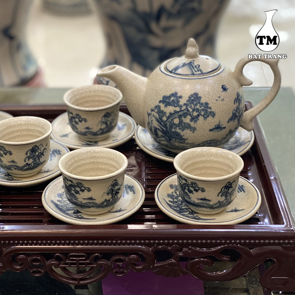 BỘ ẤM CHÉN MEN RẠN HỌA TIẾT VẼ TÙNG CHÙA 500ML