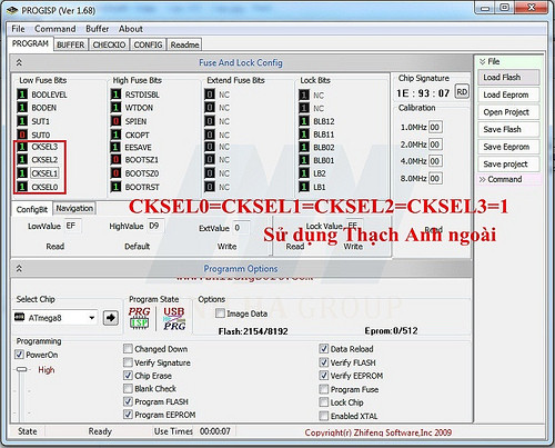 Bước 5 : Cấu hình "Fuse And Lock Config" của ATmega8 ( Phần này rất quan trọng với AVR , nếu không rõ sẽ dẫn đến Fuse Bits => Lỗi Chip )