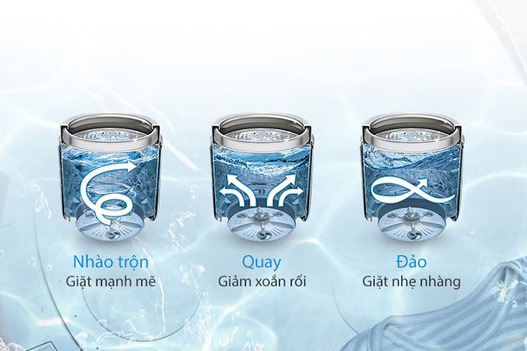 Công nghệ Turbo Drum có khả năng điều khiển lồng giặt xoay ngược chiều với mâm giặt, trong khi đó mâm giặt lại được thiết kế 1 mâm chính và 3 mâm phụ, nên tạo ra lực xoáy nước mạnh giúp đảo trộn quần áo đều hơn cũng như giảm thiểu tình trạng xoắn rối đáng kể.