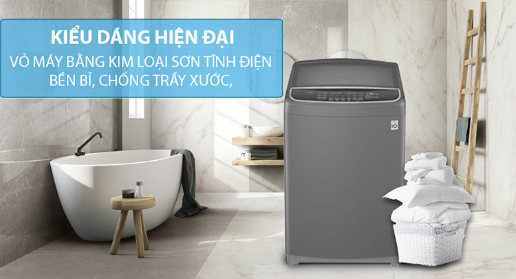 Máy giặt LG Inverter 9kg T2109VSAB thuộc kiểu máy giặt lồng đứng cùng với bảng điều khiển nằm ở phía trước quen thuộc, chất liệu vỏ máy được làm bằng kim loại sơn tĩnh điện bền bỉ và giảm thiểu tình trạng trầy xước trong quá trình sử dụng.