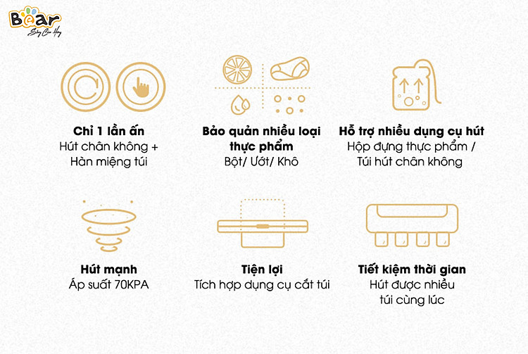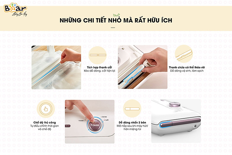 Ở phiên bản quốc tế, máy hút chân không Bear FKJ-A01F1 (VS-B01V1) được tích hợp 4 tính năng: hút chân không, hàn miệng túi, hút chân không dạng hộp, cắt miệng túi. Thay vì phải mua thêm máy hàn miệng túi hoặc sử dụng kéo để cắt túi thì với máy hút chân không Bear đã giúp người dùng tiết kiệm một khoản chi phí không nhỏ cho các phụ kiện.