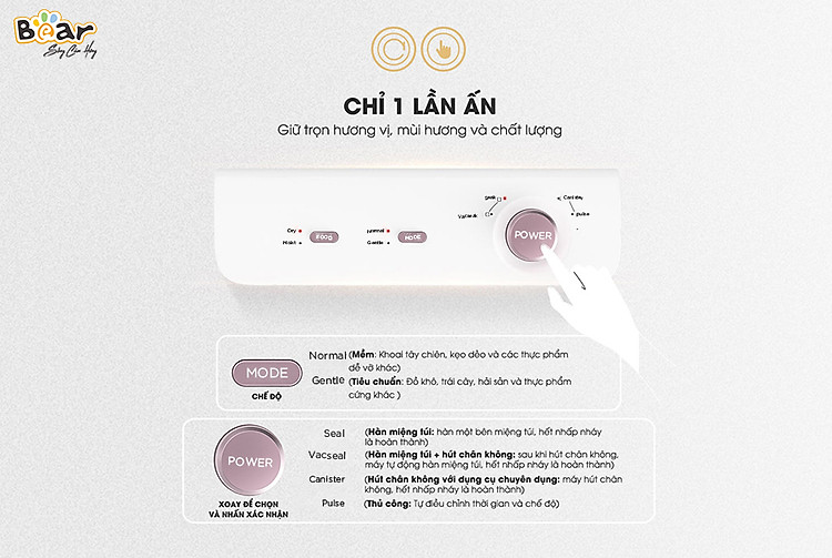 Máy hút chân không Bear VS-B01V1 (FKJ-A01F1) đã cài đặt sẵn các chế độ tương ứng khi chọn núm xoay Power: