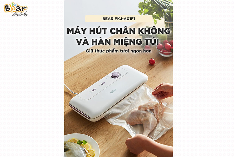 Máy hút chân không Bear FKJ-A01F1 (VS-B01V1) có thiết kế nhỏ gọn, là dòng máy hút chân không gia đình, phù hợp sử dụng trong gia đình, nhà hàng, cửa hàng kinh doanh nhỏ lẻ, hàng tạp hóa,